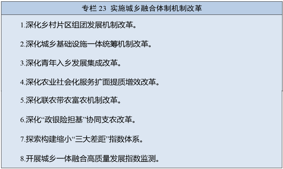 深化城乡土地制度改革 。健全与宏观政策和区域发展高效衔接的土地管理制度,建立新增城镇建设用地指标配置同常住人口增加协调机制,探索建设用地总量按规划期管控模式,实行统筹存量和增量综合供地。稳步推进农村第二轮土地承包到期后再延长三十年试点,深化农业“标准地”改革,探索承包地经营权流转价格形成机制。推进全域闲置农房盘活,深化集体林权制度改革。有序推进农村集体经营性建设用地入市改革,健全土地增值收益分配机制,建立健全城乡统一的建设用地市场、价格形成机制和收益分配制度。