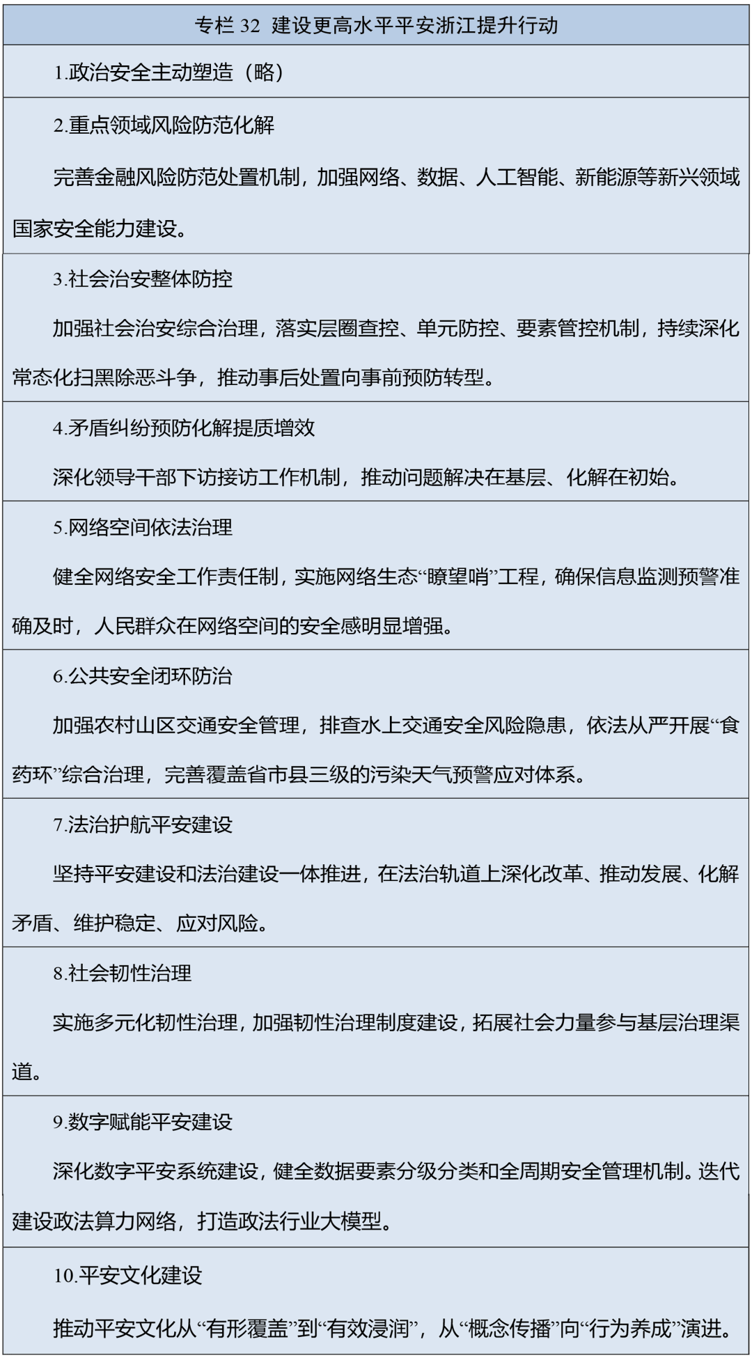 ——治理体系和治理能力现代化实现重大突破,社会充满活力、安定有序的标识更加鲜明。打造新时代党建高地和清廉建设高地走深走实,党的全面领导巩固加强,社会主义民主法治更加健全,社会公平正义进一步彰显,各领域法治化水平全面提升,“大平安”理念更加深入人心,统筹发展和安全更加有力,新时代“枫桥经验”、“后陈经验”金名片持续擦亮,重点领域风险有效防范化解,社会治理和公共安全治理水平明显提高,建成平安中国示范区,中国特色社会主义社会治理和法治道路优越性在浙江充分彰显。