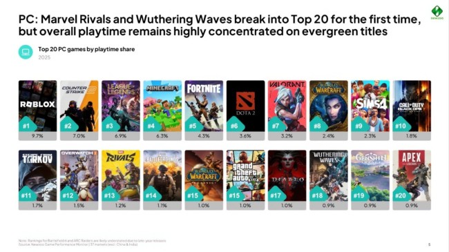 三大平台呈现不同格局。PC端长尾市场在参与度与营收上同步增长。PlayStation端,非Top20的增长确实存在,但消费仍以IP为主导:2025年进入PlayStation前20的新作品均依托重磅IP(《漫威争锋》《怪物猎人:荒野》《战地6》)。Xbox格局更模糊:非Top20的参与度有所增长,但营收分布未能同步。Newzoo认为,这是因为Game Pass促进了游戏发现与试玩,却未能将广度转化为相应消费。